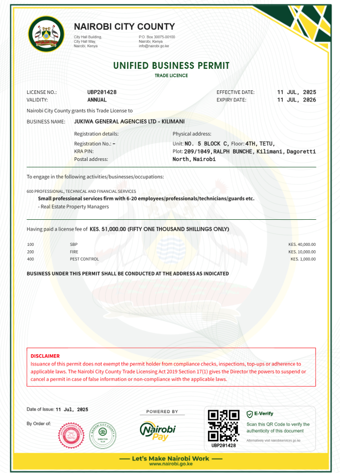 Before you deal with any real estate agent or management company, these are some of the certificates that you should ask them to provide you. Jukiwa General Agencies Ltd is properly registered and carrying out real estate business in a legit way. Our clients can have the confidence that they will get value for their money.Â